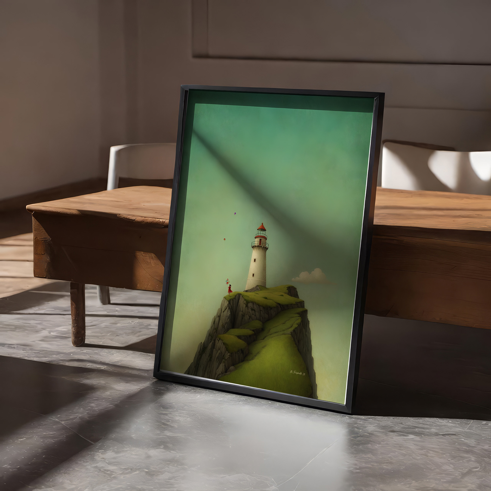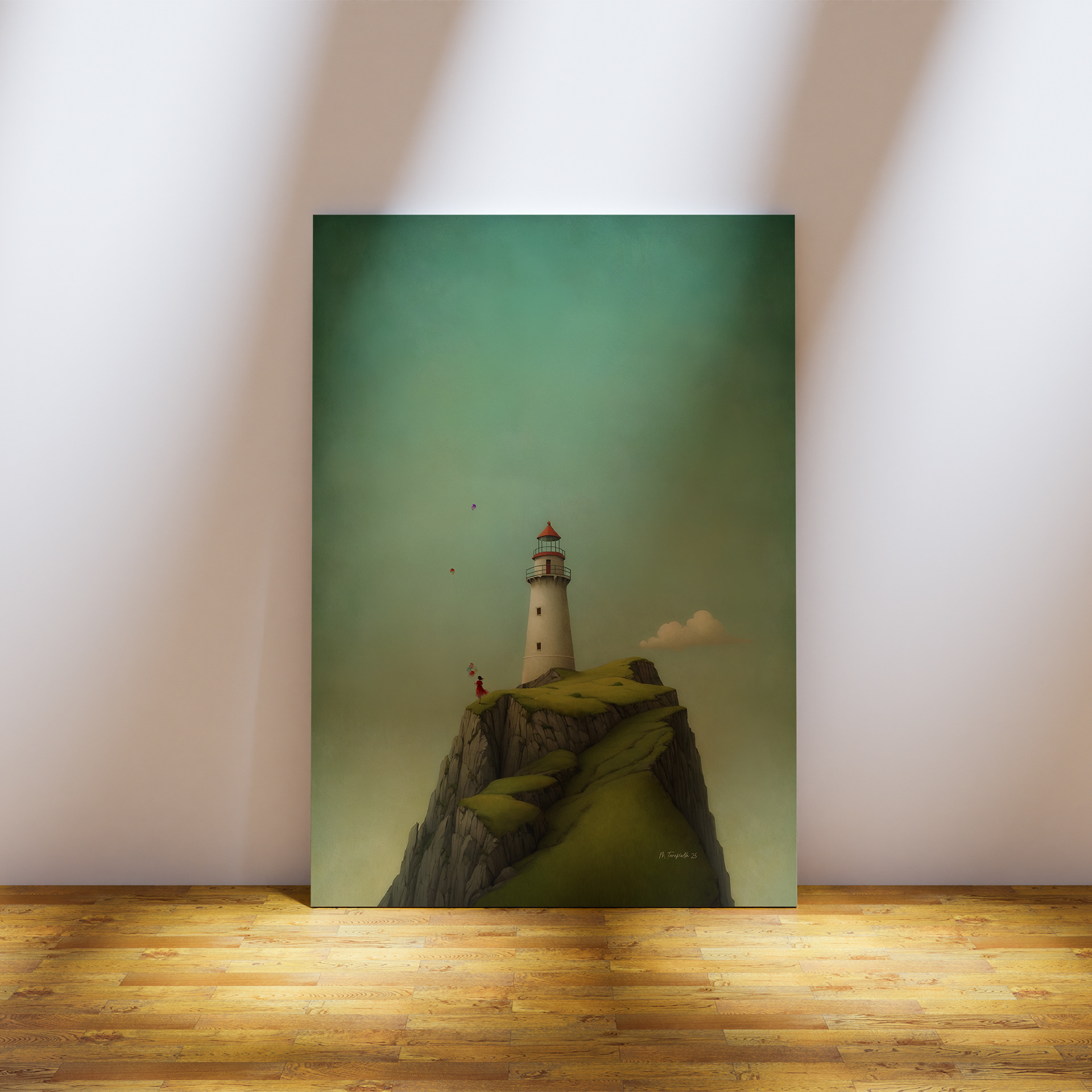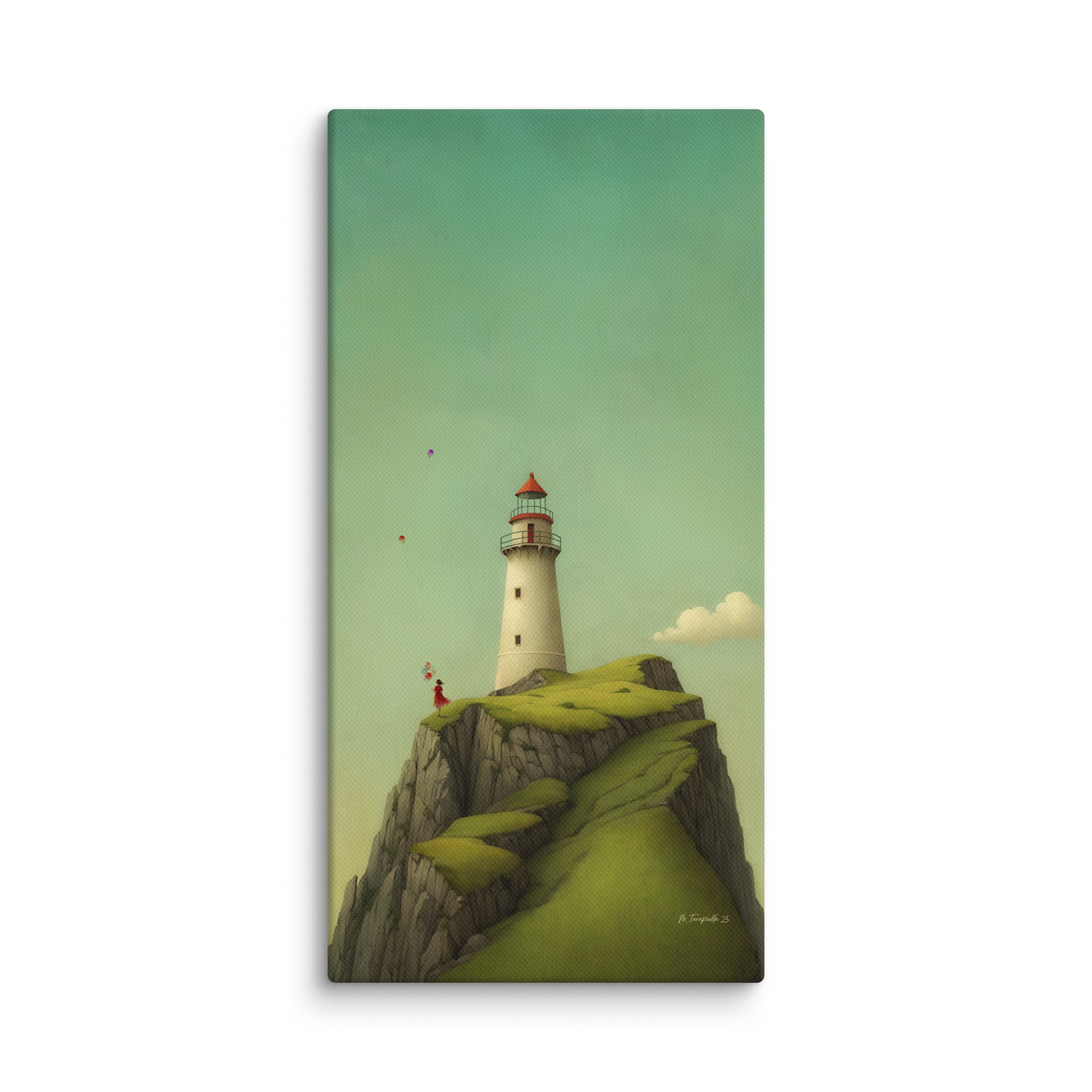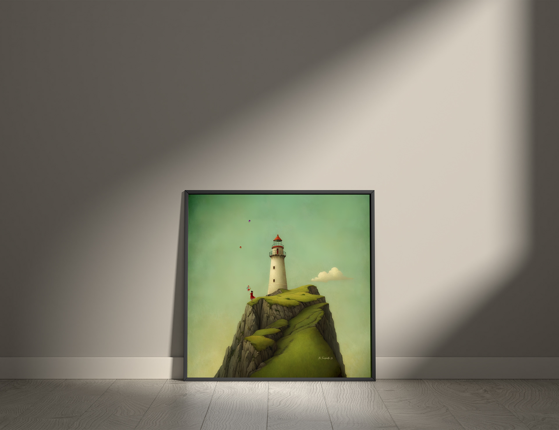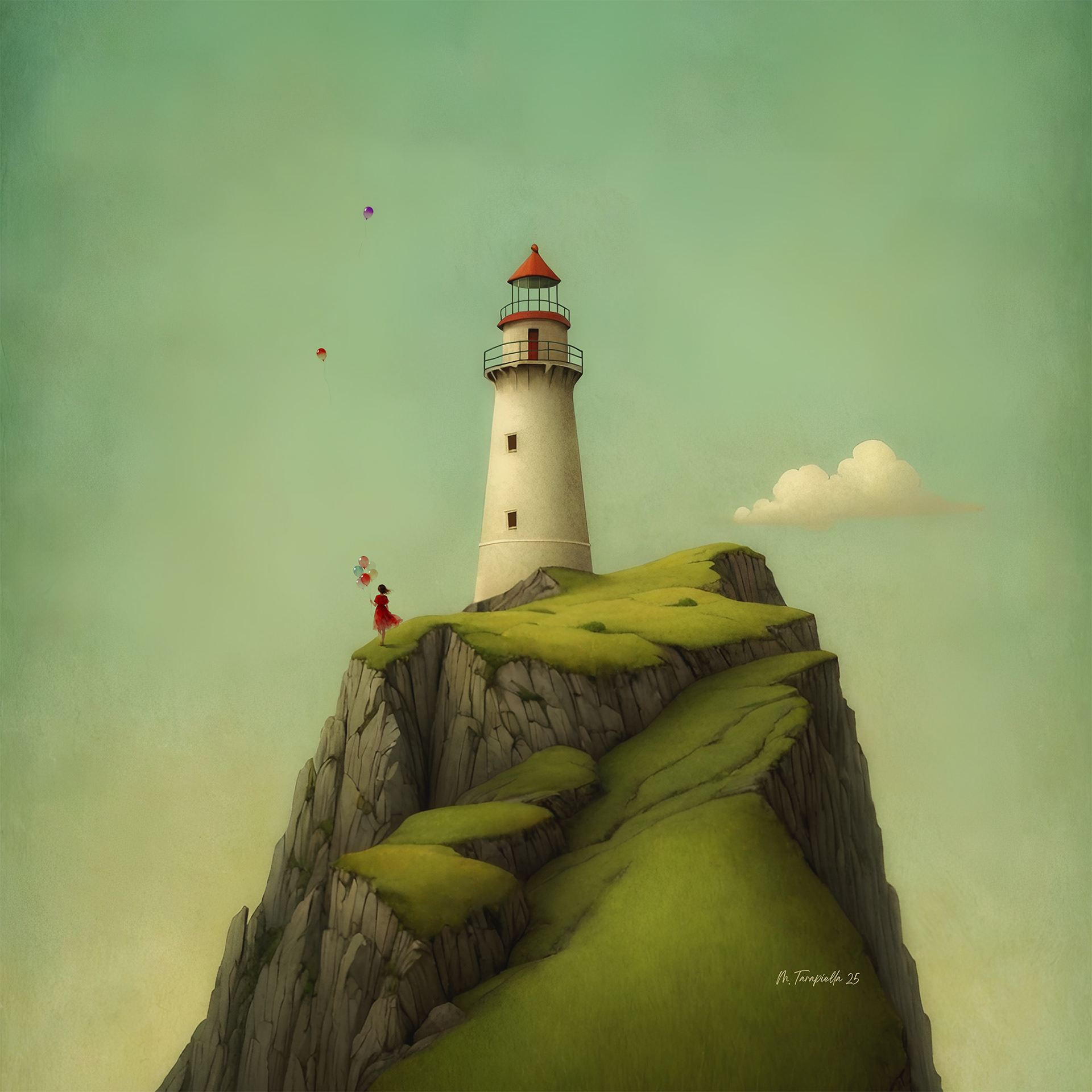 A figure with balloons facing the sea.